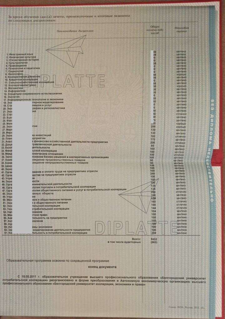 Если вам необходимо купить такой диплом то лучше компании чем «Диплатте» не найдешь. Мы работаем уже не один десяток лет. За эти годы была накоплена огромная база картинок дипломов всех ВУЗов России и не только. Любой диплом должен быть подкреплен настоящими подписями и печатями которые мы берём из этой базы. Также для настоящего оценочного листа нужны все предметы. Поэтому вы можете быть уверены, что заказав диплом нового российского образца у нас вы получите настоящий документ. Мы используем настоящие бланки ГоЗнак. Поэтому с этой стороны тоже никто не сможет никак подкопаться. А если брать вузы которые уже не существуют, у них отозвана лицензия или они были реорганизованы, то вообще можно не переживать по поводу подлинности диплома и его проверок.