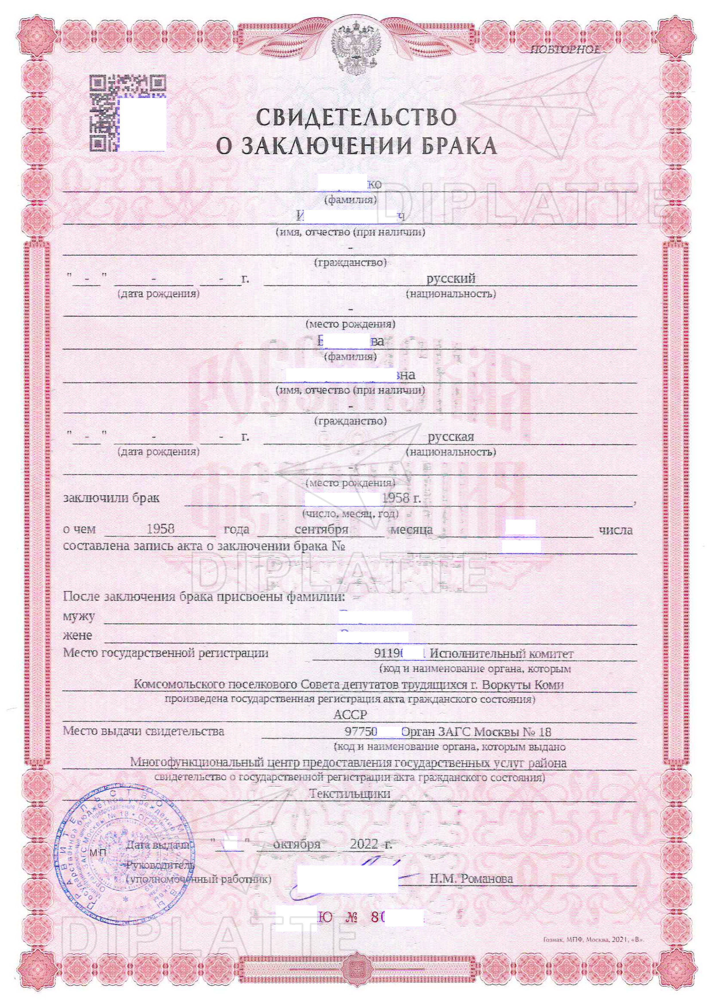 Очень часто свидетельства ЗАГС подделывают с новыми данными, где указываются нужные данные прямых родственников. Например по национальности супруга можно получить гражданство определённых государств. Также дата заключения брака может свидетельствовать о присутствии вас в определённый день в данном городе. Или вам просто нужно убрать какие-то данные супруга(и) из свидетельства, потому что они не стыкуются с другими документами поданными например на гражданство или вид на жительство. Вообще позиция прям очень популярная и заказываемая практически каждый день!